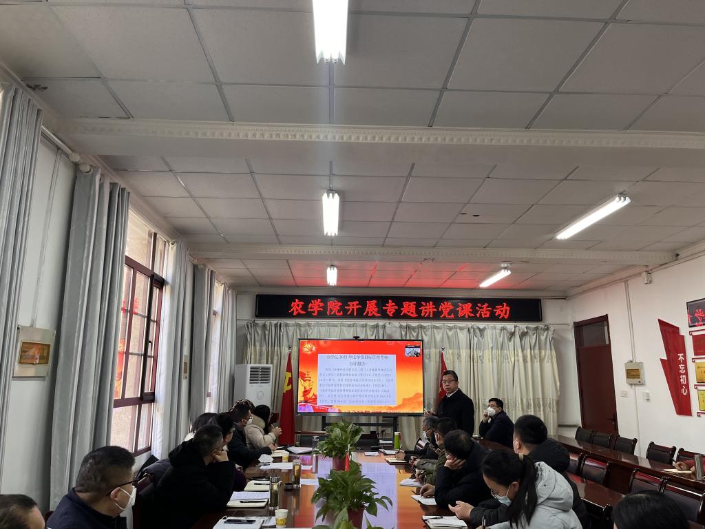 为了进一步落实党的二十大精神,推动农学院各项事业高质量发展,1月11日上午,农学院党委书记何世潮在学院会议室面向全院教职工做题为《认真学习宣传贯彻习近平新时代中国特色社会主义思想和党的二十大精神,全面总结2022年成绩与经验,全力推进2023年高质量发展》的专题党课。党课由学院党委副书记、院长崔广荣同志主持。