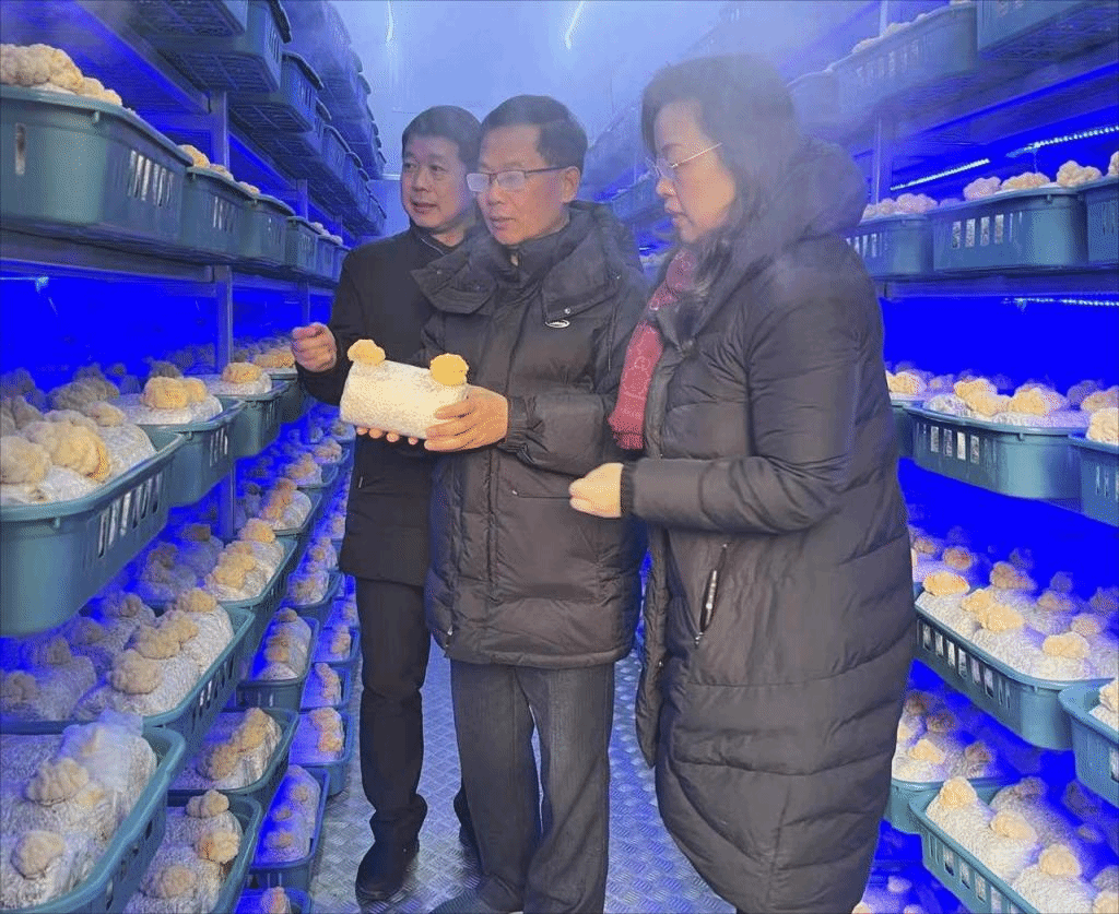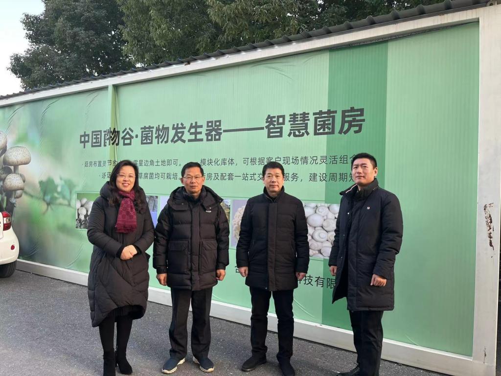 1月16日,农学院何华奇教授与生命与健康科学学院孙玉军教授、环亚在线手机版(大中国区)创业大学生——安徽来一克实验科技有限公司总经理郭凯等到长丰县中国菌物谷考察食用菌智慧方舱项目。安徽省食用菌行业协会会长、玉隆农业高科技股份有限公司总经理常莹等陪同参观。