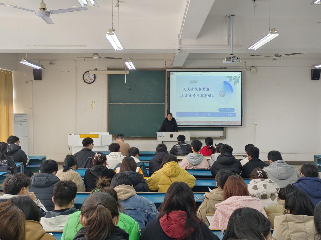 2月19日上午,人文学院于新知楼A204召开新学期主要学生干部会议。人文学院党委副书记李沙娜、全体辅导员及班级主要班委参加。会议由焦雪松主持。