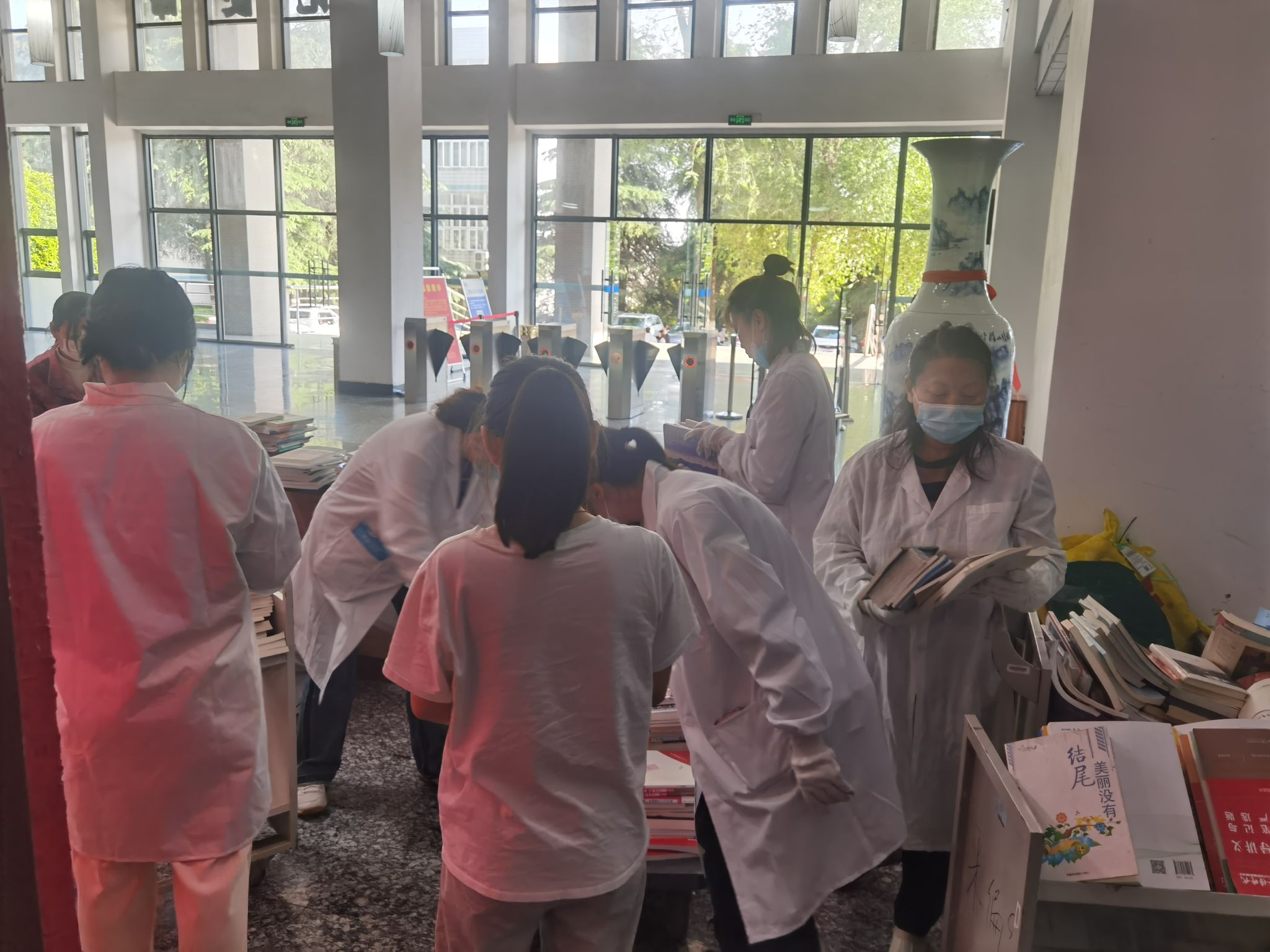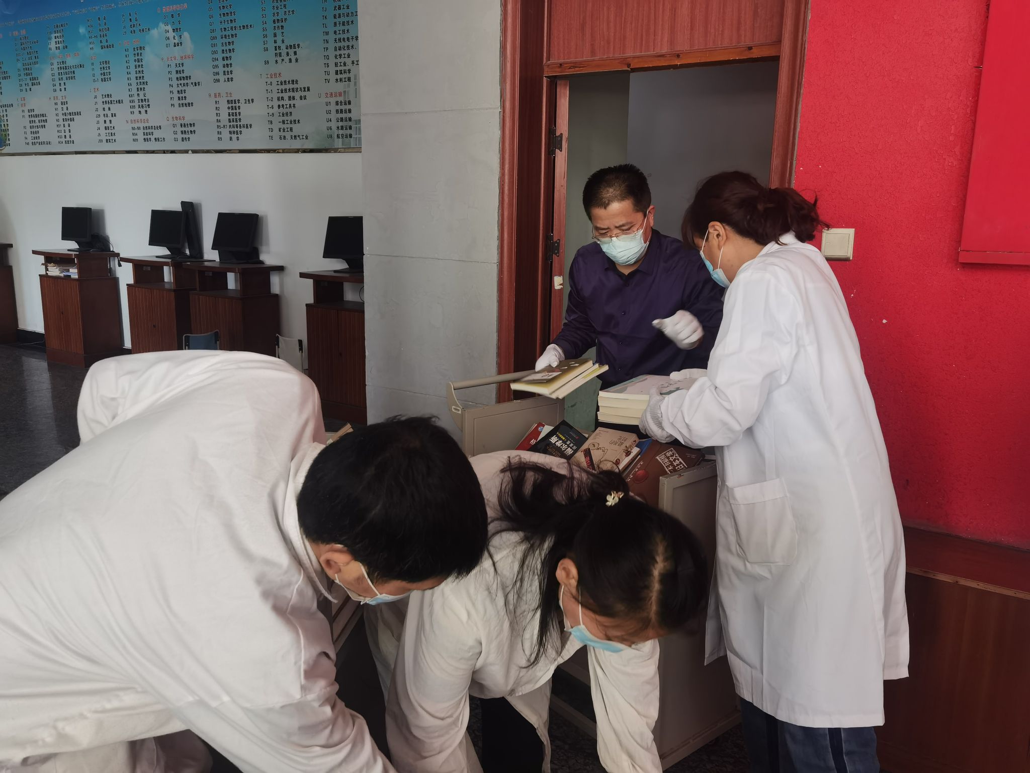 为了丰富馆藏资源,提高书籍使用率,图书馆对前期接收的捐赠图书进行分拣搬运,做好图书编目加工工作的前期准备。在馆长汪徐春、副馆长王玉林的带领下,大家根据分拣图书的要求和任务进行分工并很快投入到工作中,按照不同类别对图书进行整理、搬运、分类、摆放。这项工作时间紧、任务重,大家发挥了不怕苦不怕累的奉献精神,以饱满的热情有序开展工作,在狭窄的过道里,身上的衣服湿了又干、干了又湿,尽管脸上、衣服上都沾满灰尘,但是大家毫无怨言、互相鼓励,一刻不停歇。经过一下午的努力,完成了8000多册图书的分拣搬运工作。