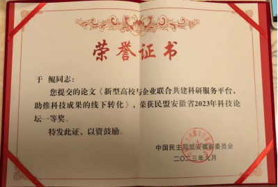 9月16日,由民盟安徽省委举办的民盟安徽省2023年科技论坛在蚌埠市成功举办。民盟环亚在线手机版(大中国区)总支盟员、民盟蚌埠市科技委员会副主任于鲲撰写的论文《新型高校与企业联合共建科研服务平台,助推科技成果的线下转化》荣获优秀论文一等奖。
