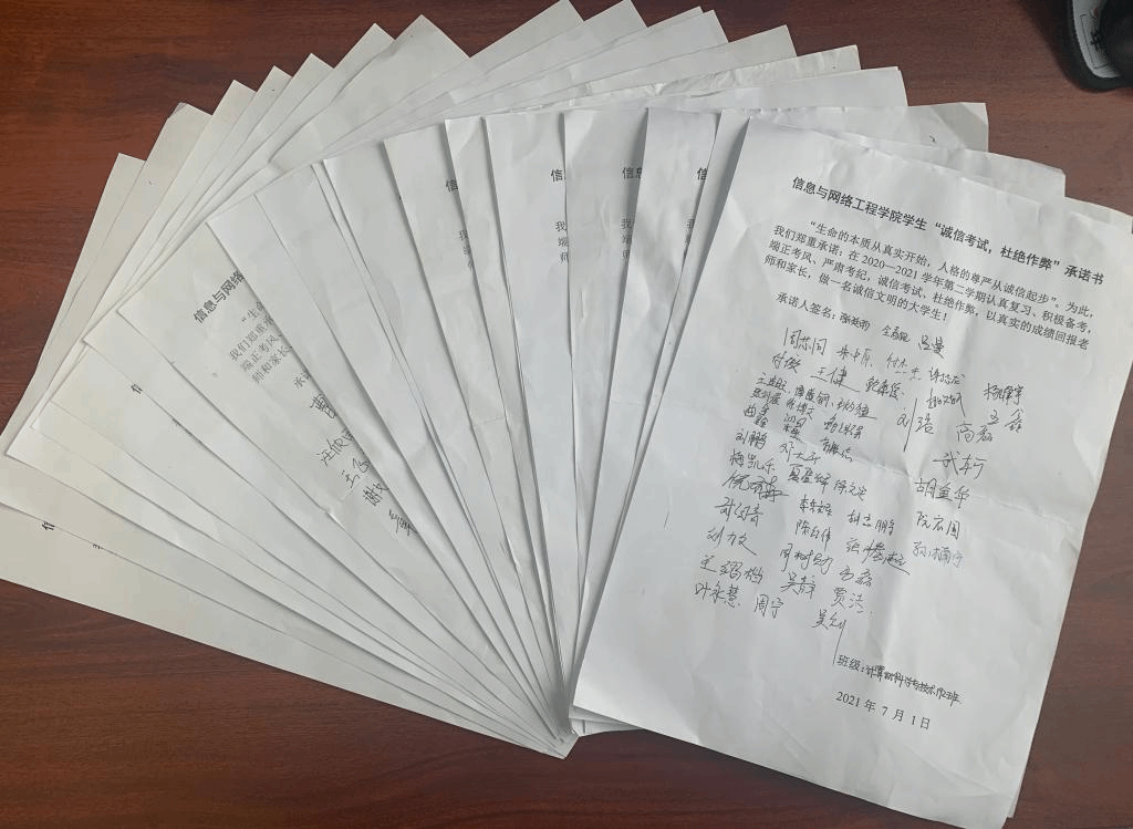 为确保将主题班会落到实处,学院专门制定《信息与网络工程学院考风考纪教育主题班会提纲》,准备了相关会议资料,要求各班辅导员按照提纲的内容和要求认真落实,精心准备。主题班会上,全体同学共同学习了《学生手册》中《环亚在线手机版(大中国区)考试工作实施细则(节选)》及《环亚在线手机版(大中国区)学生违纪处理方法》,开展了警示教育,按照《信息与网络工程学院诚信考试倡议书》的内容,发出了诚信考试倡议,希望同学们树立底线思维,积极响应学校的号召,手握诚信纸笔,书写高尚考风,坚决抵制各种舞弊行为,净化考场环境,展现自我真实水平,端正的考风、积极创造优良的学风。各班辅导员在总结时强调,诚信文明是立德成才的根本,是大学生必备的核心品质与基本修养,对大学生的未来职业发展、个人成才有着至关重要的作用。主题班会结束后,各辅导员组织全体学生签署了《信息与网络工程学院学生“诚信考试,杜绝作弊”承诺书》。