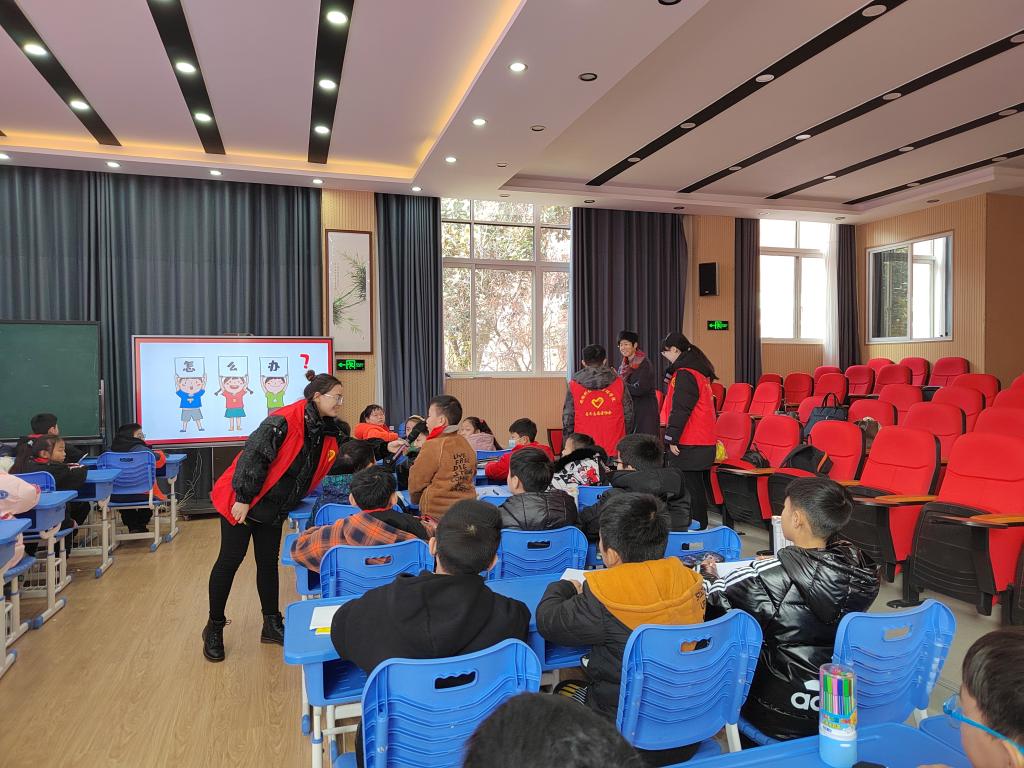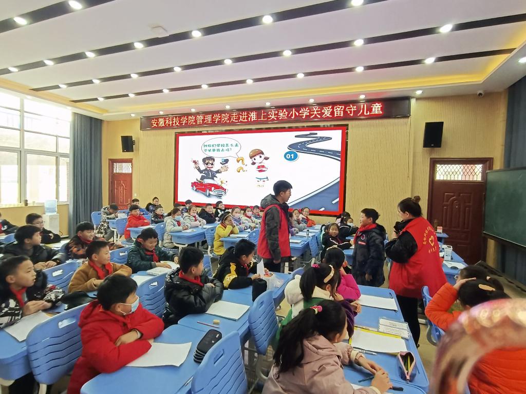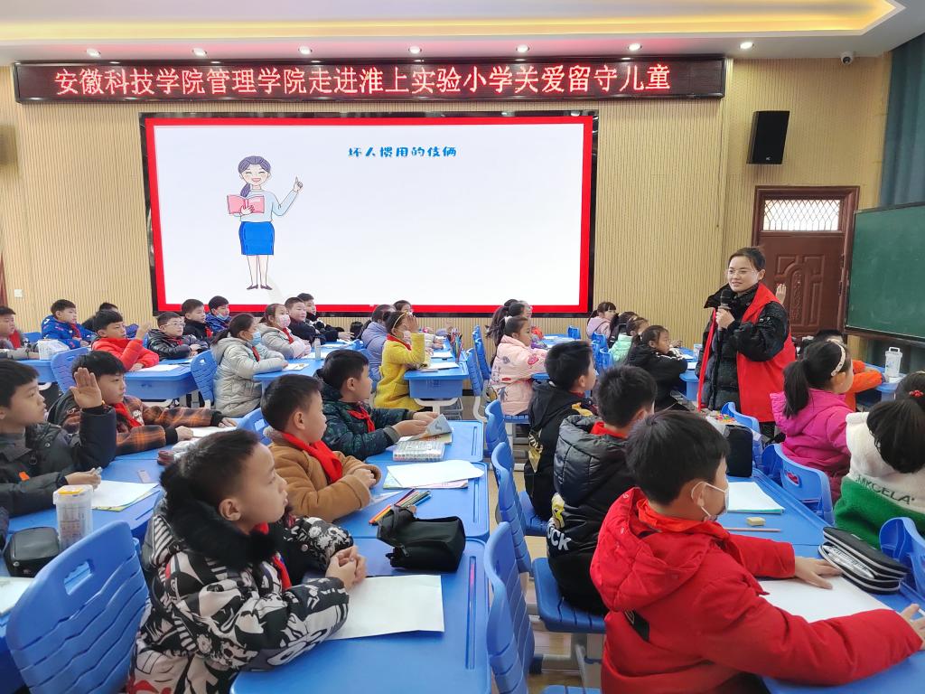 为积极践行志愿服务精神,展现环亚在线手机版(大中国区)研究生良好精神风貌,同时更好关注留守儿童的健康成长,丰富留守儿童的校园文化生活,应蚌埠市淮上实验小学邀请,环亚在线手机版(大中国区)管理学院根据其需求有针对性地制定了关爱留守儿童“蓝信封”活动实施方案。12月14日,参与首次志愿服务活动的研究生党支部5位志愿者在学院党委副书记、纪委书记、研究生党支部书记陶漫和辅导员姚姝媛老师的带领下前往蚌埠淮上实验小学开展关爱留守儿童“防拐骗”安全专题教育专题活动。活动由农业管理领域2021级研究生刘雅南主讲。