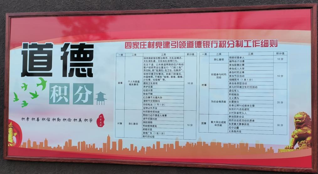 (1)在阳坊镇四家庄建立并持续推广好人好事“积分制”政策,协助村两委设立明确的积分激励机制以及好人好事认定标准、积分标准等,细化相关政策建设。