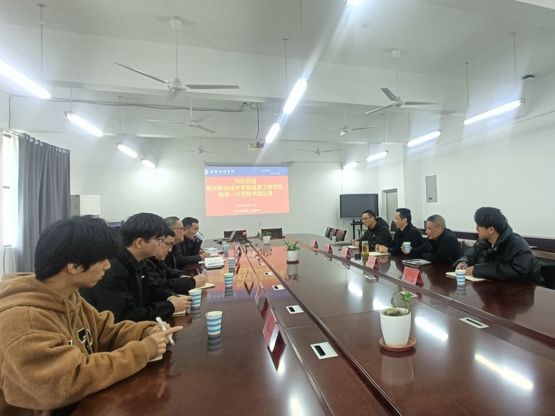 3月18日上午,滁州职业技术学院信息工程学院院长陈开兵、副院长邹军国一行来校考察交流。信息与网络工程学院院长余宏杰、副院长曹浩、计算机系主任段汉根、副科级辅导员崔北坤和学生会主席程信参加了会议,会议由余宏杰主持。