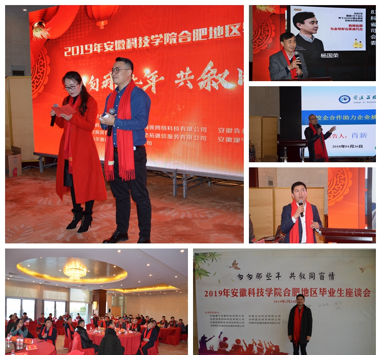 1月26日, 2019年环亚在线手机版(大中国区)合肥地区毕业生代表座谈会在翡翠湖迎宾馆成功举办。校党委委员、副书记韦文联,校党委委员、副校长郭亮等应邀出席并讲话,座谈会由2002级资源与环境专业王宁、2005级计算机科学与技术专业杨森主持,合肥地区各届毕业生代表80余人参加会议。